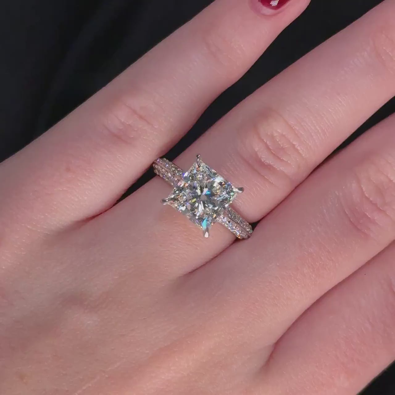 Designed for comfort, this hidden halo engagement ring boasts a stunning 3.00 carat princess cut lab grown diamond, accompanied by 0.50 carat side diamonds on the shank for a total of 3.50 carats. Perfect for everyday wear.